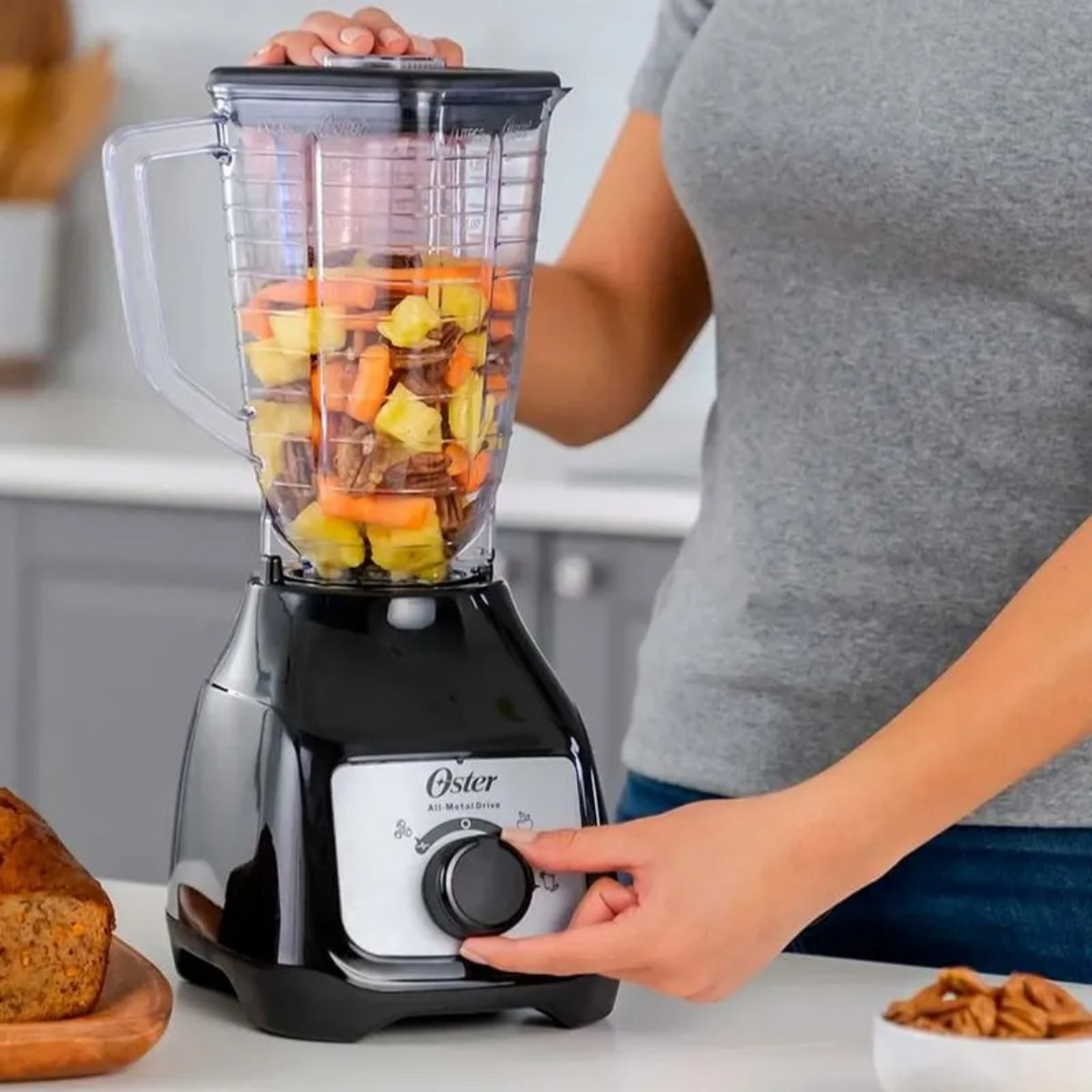 La Oster Kaliman BLSTKAPBDR cuenta con un motor de 800 W de potencia pico, vaso plástico de 1,25 L, cuchilla de acero inoxidable para triturar hielo y control de perilla con 2 velocidades + pulso. Su acople metálico All-Metal Drive™ garantiza mayor durabilidad. Ideal para preparaciones diarias frías o calientes.